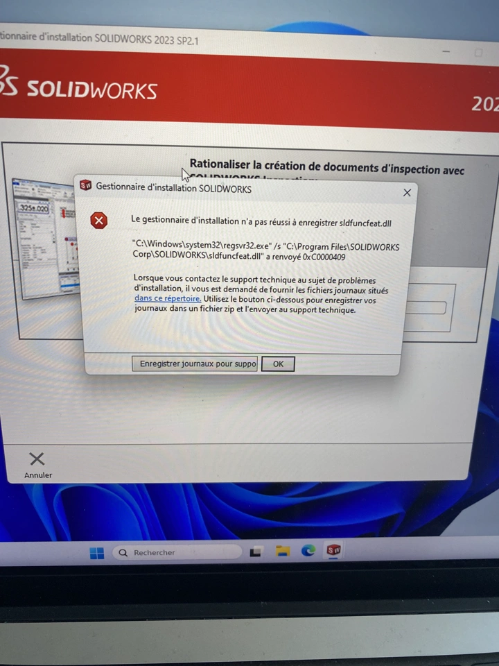 Je suis utilisateur Mac (MB Pro M2Pro 16Gb RAM) et j'ai une VM Windows par Parallèles. Quans j'installe SolidWorks avec l'installateur, à environ 31% (moment où SW s'installe) j'ai une erreur qui me dit que le gestionnaire d'installation a pas reussi à enregistrer sldfuncfeat.dll.