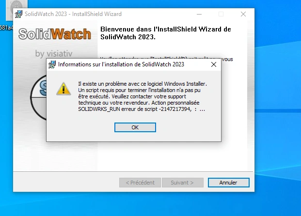 "There is a problem with this Windows Installer package. A script required for this install to complete could not be run. Please contact your support personnel or package vendor. Custom action SOLIDWRKS_RUN script error -2147217394."