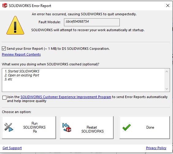 Hello, I just installed solidworks 2023 student version. However, it keeps crashing upon launching. The error I get is shown below. Any suggestions or help will be greatly appreciated. Fault Module:libcef:04068754. Thank you!!