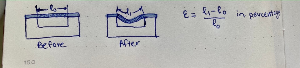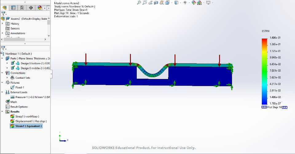 Hi, I wanted to calculate the length of the top surface to get the percentage of deformation compared to the original length. The equivalent strain default on Solidworks is very small, and it looks like a local strain (I hope I make sense).