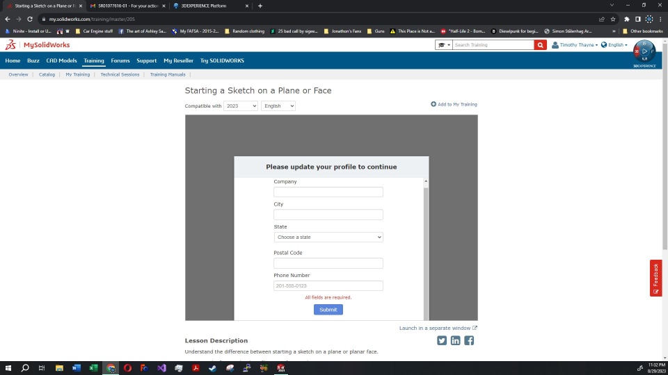 I am having issues getting the training videos to play when I log into the solid works website when I press play on any training videos I get the a window in the video player saying that I need to input the information below as shown in the attached picture. However I don't understand what company am I supposed to put into the fields since the license I am using is a student license that doesn't make any sense. So I filled out a tech support ticket and when I clicked the support link they sent in response a day later to the ticket it tells me my account doesn't have access to the 3D experience support app? Despite me going over to my account settings and details saying that my license and subscription are active as a student. So I'm kind of not sure how to proceed since the solid works software installation worked just fine its just the solid works website and 3d experience stuff that just doesn't seem to want to cooperate