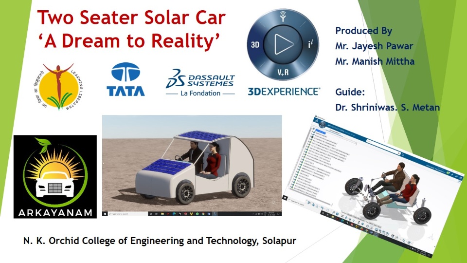 Hello friends, We are Team Arkayanam Mr. Jayesh Pawar, Mr. Manish Mittha and over project guide Dr. Shriniwas metan from N K Orchid College of engineering and technology, Solapur presenting the project, Two Seater Solar Car 'A Dream To Reality'