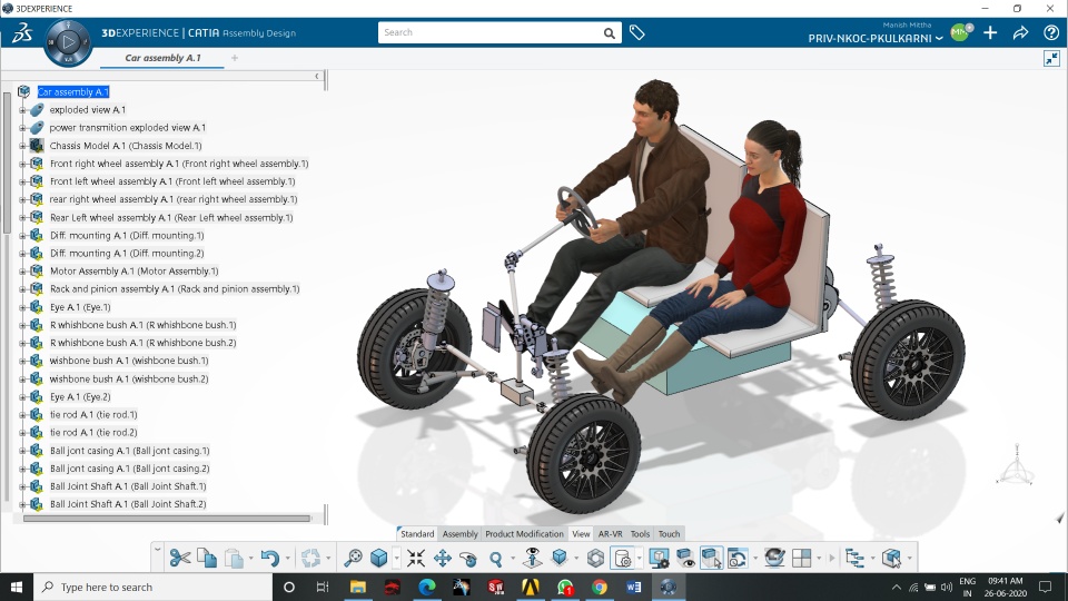 We have done wheel assembly, brake assembly, steering, power transmission, Overall car assembly done in 3D Experience Platform with the tool like part design, Generative, wireframe and Surface design, mechanical System Design, Generative Shape Design, and assembly design.
