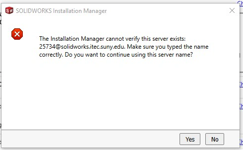 The Installation Manager cannot verify this server exists: 25734@solidworks.itec.suny.edu. Make sure you typed the name correctly. Do you want to continue using this server name?"