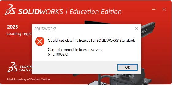 Upon launching Solidworks, I then get a warning message stating: "Could not obtain a license for Solidworks Standard. Cannot connect to license server. (-15, 10032, 0)". Solidworks then closes, not opening up the program.