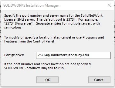 Port@server: (text box field) 25734@solidworks.itec.suny.edu