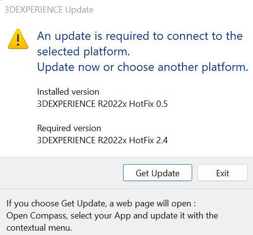 I tried opening up solidworks from my desktop and I received this pop up. How can I update solidworks? When I click get update, it brings me back to the 3D experience home page. My solidworks app never had to do this before.