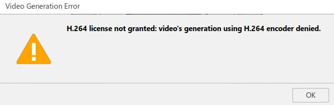 - H.264 license not granted: video's generation using H.264 encoder denied.