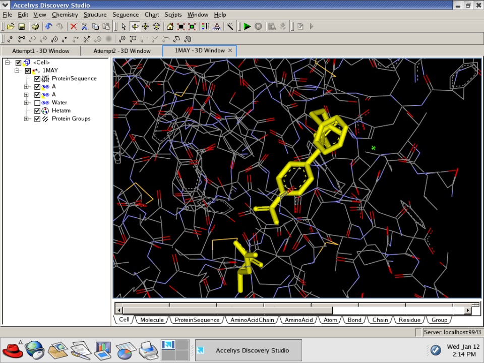 Hello, I am an academic student using DS 2.1. I am trying to use interaction filters (along with LigandFit) to basically save only poses with selected interactions between the ligand and the protein receptor. The ligand contains an amidine group which has two hydrogen bond donors that interact with a carboxylate group of the receptor. The problem is that the conformations that I'm getting with the use of interaction filters are not the ones I am looking for. The amidino group is positioned orthogonally (undesired) instead of linearly (desired). Attached is a snapshot of the work station that I use. It displays the ligand (highlighted in yellow) and the carboxylate group of the protein (also in yellow) and you can see the pose that I want to keep. The reason is that I am working with another protease that has similar homology and using an analogous inhibitor. But I want DS to save a pose that is similar to trypsin & its inhibitor (the file is 1MAY in the protein data bank). Any help would be appreciated.