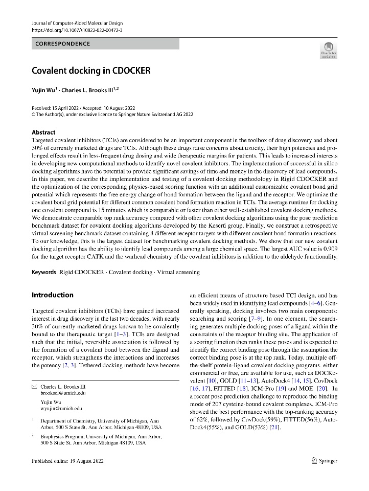As far as I know, Mr Charles L. Brooks III team has published some papers to enhance the CDOCKER including covalent docking (doi 10.1007/s10822-022-00472-3), GPU Accelerating (doi 10.1021/acs.jctc.0c00145) and Flexible CDOCKER ( 10.1002/jcc.24259 & 10.1021/acs.jcim.1c01078) in recent years.