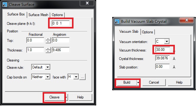 Step 3: Ensure TiO2 cell document active. Cleave (0 0 1) crystal face and add a vacuum slab with a thickess of 30 A. See attached figure 2 for details. Thus a document named "TiO2_xx (0 0 1).xsd" is generated.