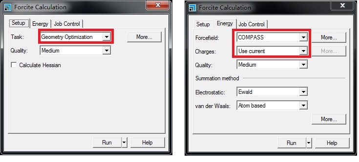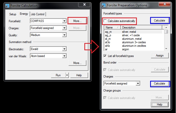 Step 2: Ensure TiO2 cell document active. Open Forcite Calculation-->Energy tab, then choose "Forcefield" as "COMPASS" (you can also choose "COMPASSII" , or "COMPASSIII", any one is OK). And then, Click the "More..." button to open "Forcite Preparation Options dialog" dialog. Uncheck "Calculate automatically", then click the two "Calculate" buttons to set force field types and charges (See attached figure 1). Close all opened dialog.