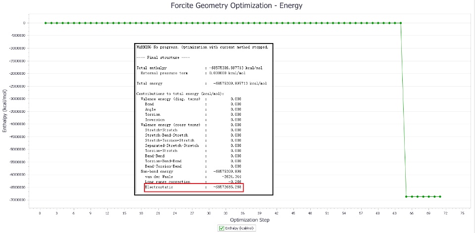 After geometry optimization is completed. Checking the curve of Energy vs optimization step will find an abnormal high energy as shown in attached figure 4. Besides, an extremely high Electrostatic energy will be found in txt document (see figure 4). Moreover, check the optimized atoms on TiO2 surface will show an abnormal overlap between O atom and Ti atom (see figure 5).