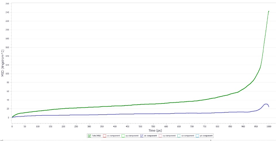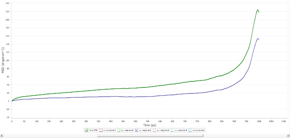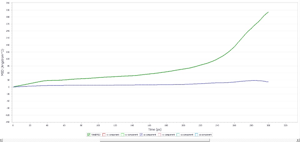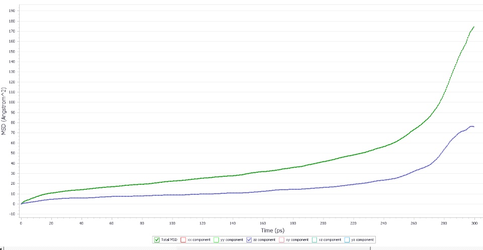 NVT dynamics simulations are conducted for this layer structure under 333.15K for 300ps and 1000ps. Finally, part 2 is in contact with part 1. Then I analyze mean square displacement (MSD) for part 2 based on trajectories.