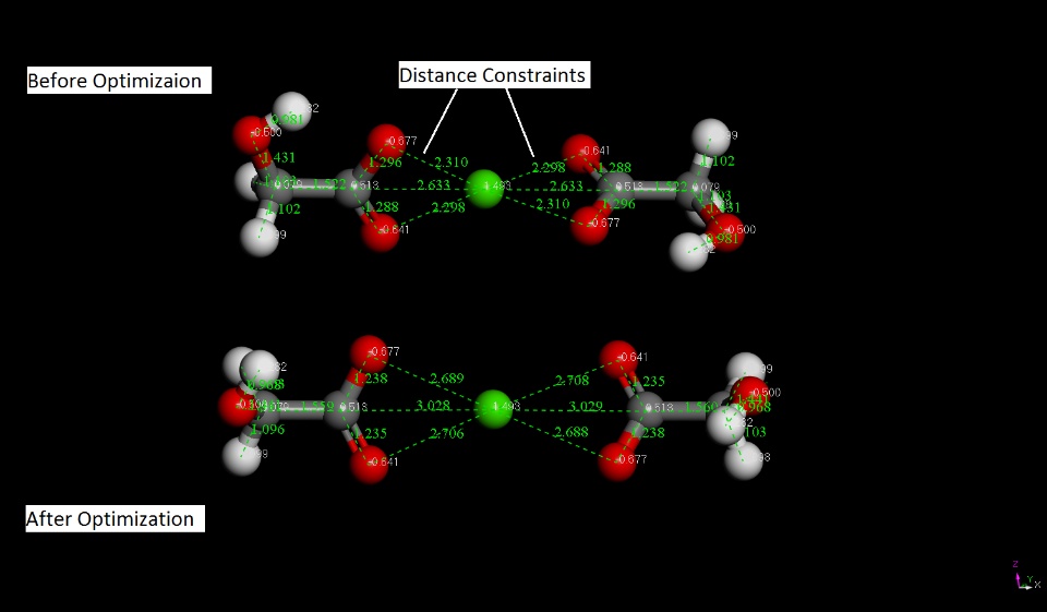 I am trrying to create calcium glycolate moleucle in the MS7. I assined dft charges to the molecule and then contrained distance between O- (anion) and Ca++ (cation) [refer the image]. Also, I selected auto force field assigneent and use current charge option.