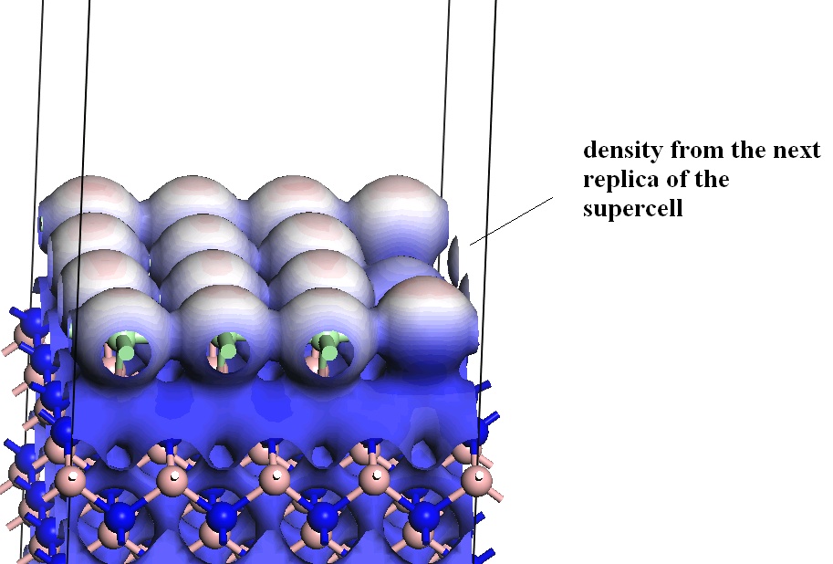 I am trying to plot the electrostatic potential on the electron density for a crystal surface in DMol3 (with periodic boundary conditions). However, the density of the next replica overlaps with the density I want to plot (see attachement). Anyone who know how I can get rid of this "extra" density?