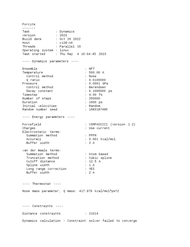 I try to figure out which maximum time step + fix bonds setup I can apply to my polymer molecular dynamics in Forcite. At some point (time step = 4 fs + fix bonds) the calculation set up dies with following error output, std.err: "dynamics calculation - Constraint solver failed to converge (function/property "Compute") at -e line 25.", resp.