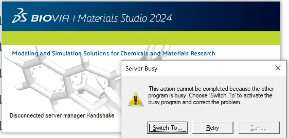 The "Server Busy" pop-up obstructs all actions, and returns after clicking retry or the X button. This pop-up persists upon restarting Materials Studio.