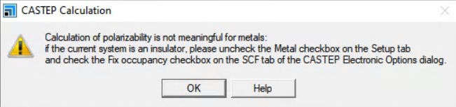 I have a metallic structure. I have run geometry optimization first with 550eV energy cutoff, 0.02 k-mesh, and ultrasoft PP. Then when I tried to run a Phonon calculation with IR frequencies calculation it always failed. I then did a phonon calculation specifically for metal (clicking the checkbox in the CASTEP Calculation setup tab), and it was successful. But there were large -Ve frequencies for acoustic bands (~9.8 THz). So, I wanted to check the IR frequencies corresponding to the -Ve frequencies. But if I select both metal and IR calculation (as well as polarisability), an error message pops up like the below - Now, I performed an IR frequency calculation with the resultant phonon structure, but there was no -Ve frequency.