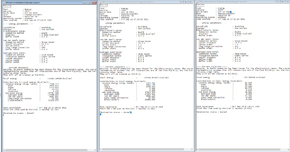 I have attached a picture concerning my query. The sum of the individual contributions to the total energy is significantly different from the total energy. Shouldn't the sum be equal to the total energy? If anyone could, please also interpret the meaning of the warning message.