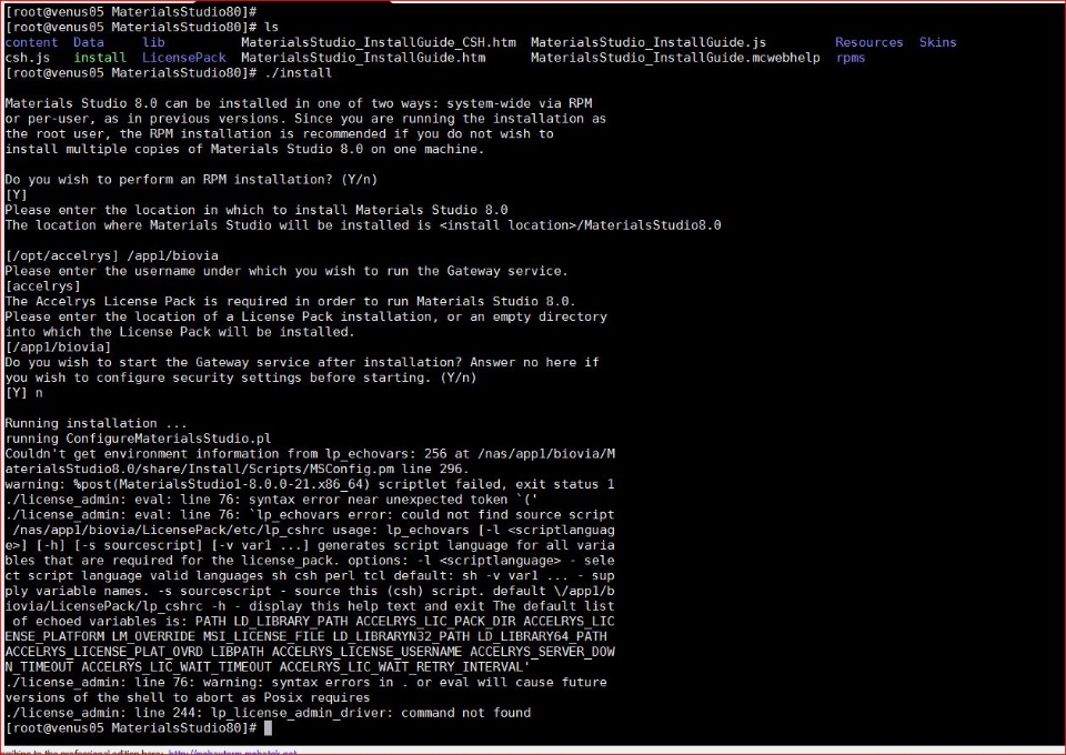The installation failed with some error messages given(Captured in the attached file). Check and found the files "/nas/app1/biovia/LicensePack/etc/lp_cshrc" is not available.