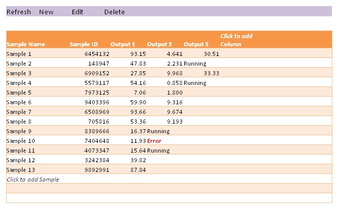 Notice that both axes should be editable without affecting the others. For example, new samples can be added at the end, without loosing the previously calculated values. Likewise, additional outputs can be chosen at a later time, and will be appended to the previously calculated values.