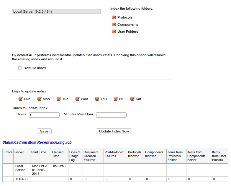 On one of our AEP9.2 servers on RHEL 6.5 the XMLDB indexing is not working. It's configured to run daily at 1am, and I can confirm that it does. However, the index produced is empty - searching it turns up hits from the installed collections but nothing from protocols/components created locally.