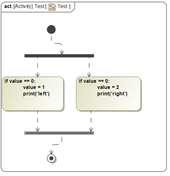 In Cameo I've worked out the following small example (see the attachment). Here I have two opaque actions that concurrently perform a Python program, with 'value' a shared integer property.