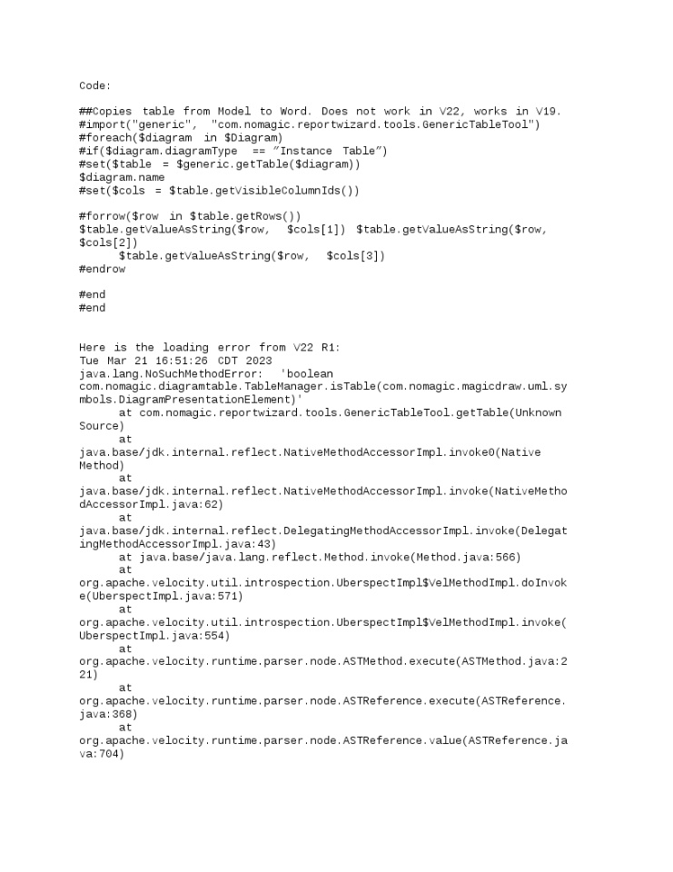We have a large audience that does not have Cameo access. As such, I am working on generating a test report template. It uses a structure with Test Scenarios, Test Cases and components that make up the test cases which verify requirements. I am using derived expressions to create tables required to meet our needs. When using Version 19, I was able to export those tables to a Word document quite easily using the genericTable WIN! Alas, I am unable t0 import the GenericTableTool in version 22 refresh 1. A member function seems to be missing. I attempted to implement via the diagramTableTool, but cannot actually access cell values successfully. Attachment shows script as well as loading error. Thank you!