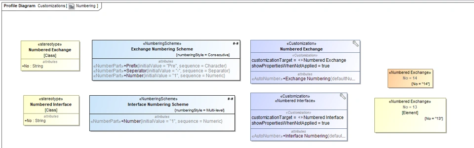 - When I created the 2nd instance of the numbering interface, I had to constantly delete the applied Numbered Exchange stereotype as you can see with the 2 examples to the right of the customization blocks.