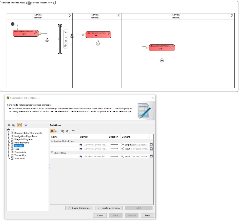 notice that when we create an object flow from the fork to the second service function action, Cameo creates an object flow instead of a service object flow. The default behavior should be to create the service object flow because that is what is flowing on service views. This is a problem in 2021x and 2022x.