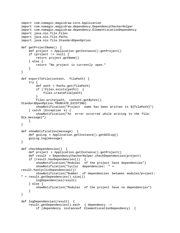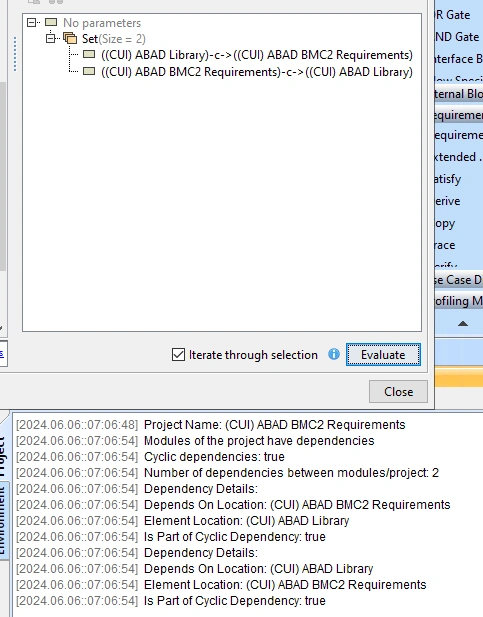 Hello - we've been trying to preproduce the cyclic dependency checker under analyze --> dependency checker menu. Our model has approximately 47,000 warnings associated with cyclic dependency so manually fixing the issues is not practical. We are attempting to create a script using the API to reproduce the dependency data shown in the dependency checker. Unfortunately, import com.nomagic.magicdraw.dependency.DependencyCheckerHelper only provides module or project level dependencies.