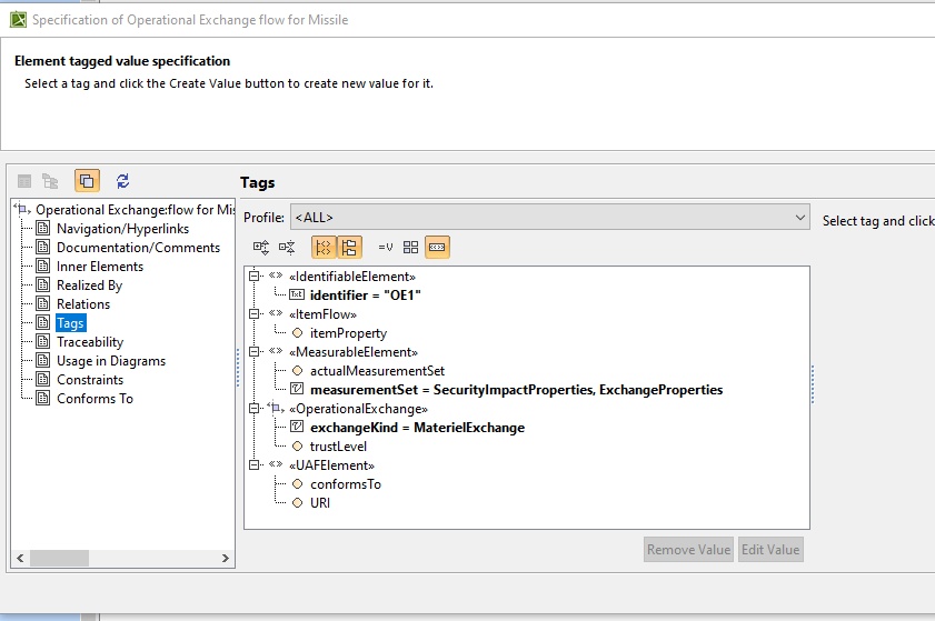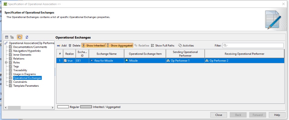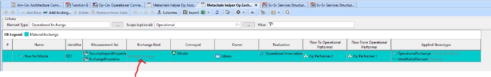 In the attached UAF project, I have one operational performer performing a material exchange with another operational performer. I'm trying to figure out how to automatically color exchanges based on their exchange kind. This would make it easy to see the difference between material exchanges, energy exchanges, information exchanges, etc. I believe this will require a metachain for the property test within the legend but I can't figure out how to get to the operational exchanges and the exchangekind tag for the operational association between the performers. I can get to the ExchanageKind once I have the ElementType as shown in the table. Attached project created in 2022x.