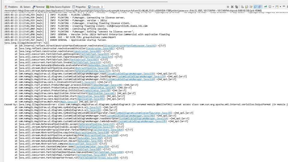 I can export the Jar and everything runs fine but when I try to debug my plugin using the MagicDraw with all plugins configuration I get some errors (attached).