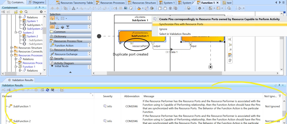 UAF: Running the validation will create pins automatically if ports have been assigned previously to the performers. However, if performing the functional architecture first and pins have already been created, then building the structural architecture, then running the validation rules, Cameo says pins need to be created to synchronize with the ports and creates duplicate pins.