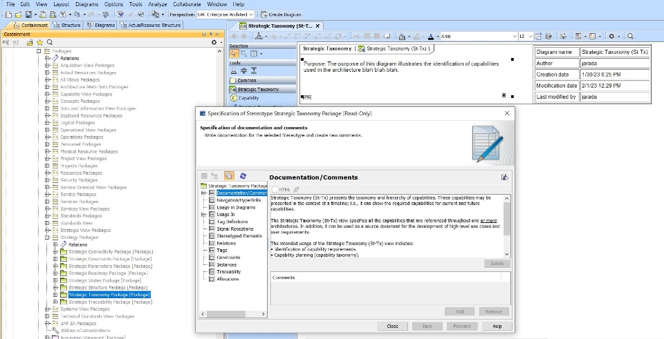 Is there a way to auto-populate a text box with the stereotype package documentation? Ex. I am creating a Strategic Taxonomy diagram and would like a text box to show the documentation that describes a St-Tx every time one of those diagrams are made.