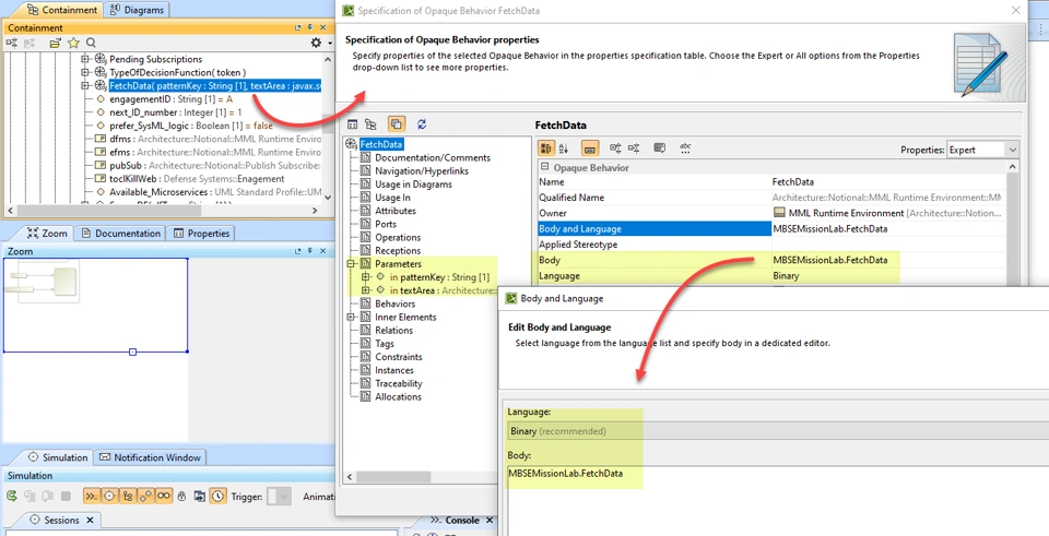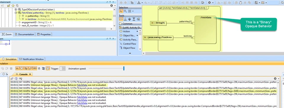 Next, here is where FetchData is being referenced as a Call Behavior action in an activity diagram. The Simulator does not recognize the binary-based Opaque Expression and needlessly fusses about the textArea parameter: