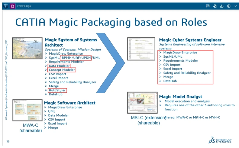 I am currently working on organizing a CATIA Magic license mapping table in Excel. As part of this, I would like to clearly understand the differences between Magic Cyber Systems Engineer (MAH) and Magic Systems of Systems Architect (MYH) licenses.