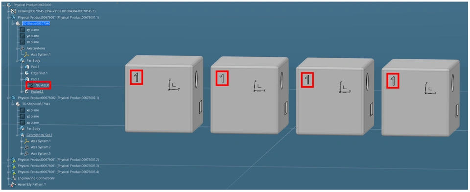 I'm currently doing some testing on assembly patterns. I have created an example. I want to change the number on each cube without having to create 4 separate parts (Currently when I edit the sketch on any instance, all the instances change with it). Is there a way to isolate certain features so I can change them on each instance, but everything else is still linked?