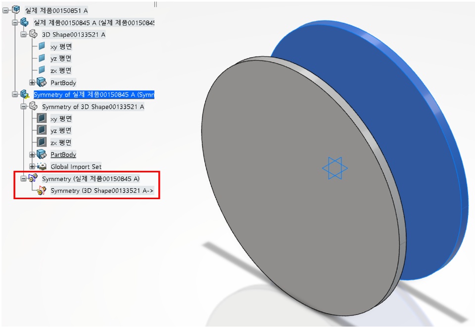 I made 'Symmetry of physical product00150845 (Grey one)' based on 'physical product00150845 (Blue one)' by using assembly symmetry function.