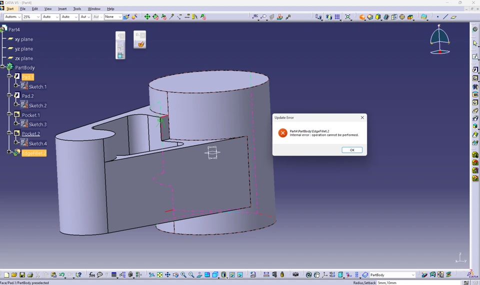 Within CATIA V5 the error is the following: Internal error: operation cannot be performed