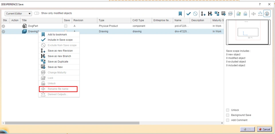 In addition to these, I can change the name while saving to 3DExperience via the "Rename File Name" command. However, after saving, this command becomes a passive form for the relevant technical drawing. (Picture 2)