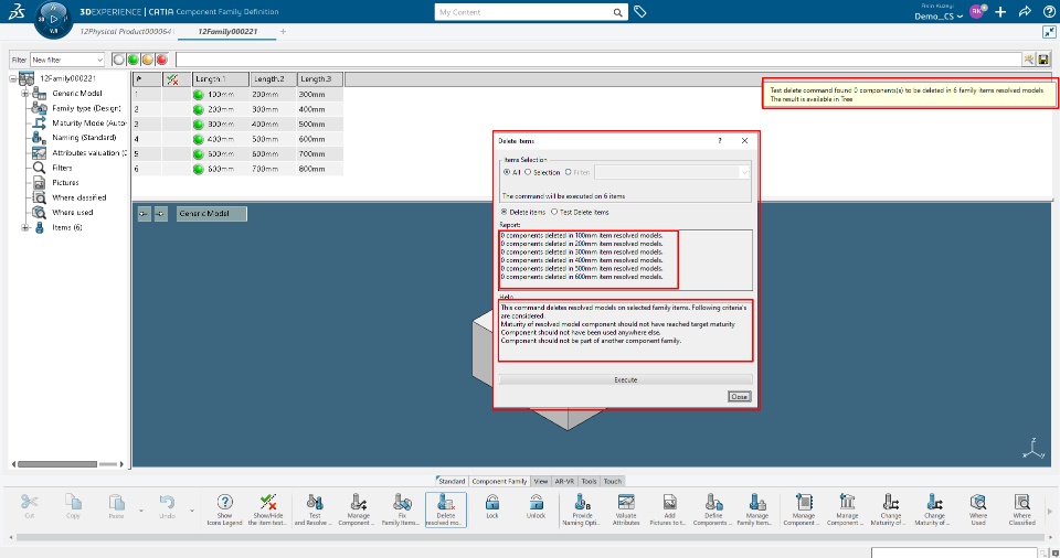 How can I bulk delete parts created in the system from the platform with the help of Component Family? There is a command called Delete Resolved Models in the Component Family Definition application, but the parts are not deleted. I get a response like ScreenShot_1.