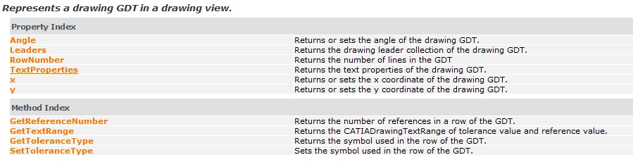 Using CATIA V5 API I would like to manipulate drawing GDT objet but I cannot find any method to set References and Tolerance values (IT | R1 | R2 | R3 in the picture).