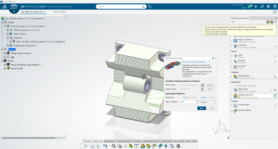 Problem is there is no clear indication where the problem lies and why the software is trying to access the server at this point. The validation step is Ok, only topology optimization run give the error.