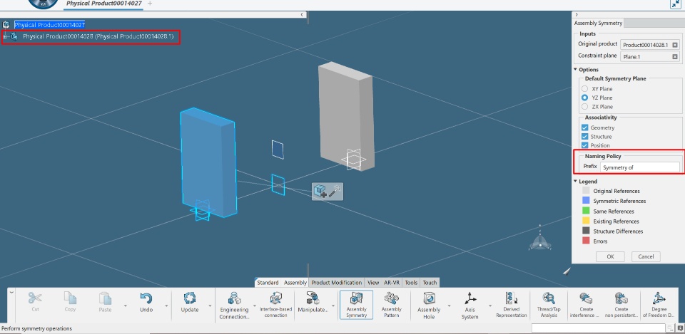When the Assembly Symmetry command in the 3DExperience CATIA Assembly interface is run, it looks like the attached picture. As you can see, there is only the Prefix option here.