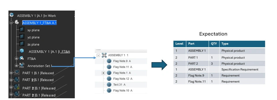 I am using the 3DEXPERIENCE platform with ENOVIA and CATIA. I have created an assembly (Physical Product) and an Annotation Set (FTA), which I then converted into requirements using the "Generate Requirement to Manufacturing" feature. As a result, I now have the components of this assembly along with their associated requirements.