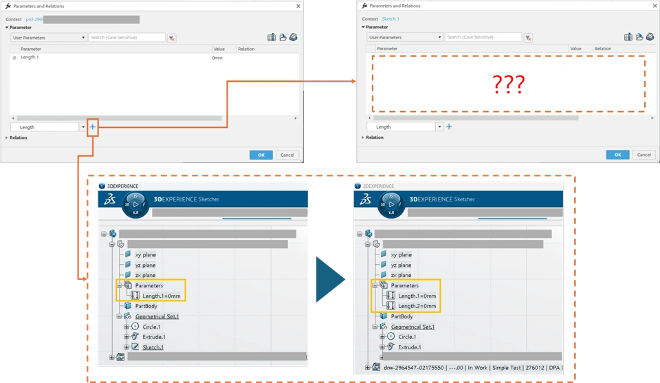 As you can see above images, my newly created parameter is appear in the tree, but everything is removed in "Parameters and Relation" windows even though "Length.1" is originally existed but disappeared too.