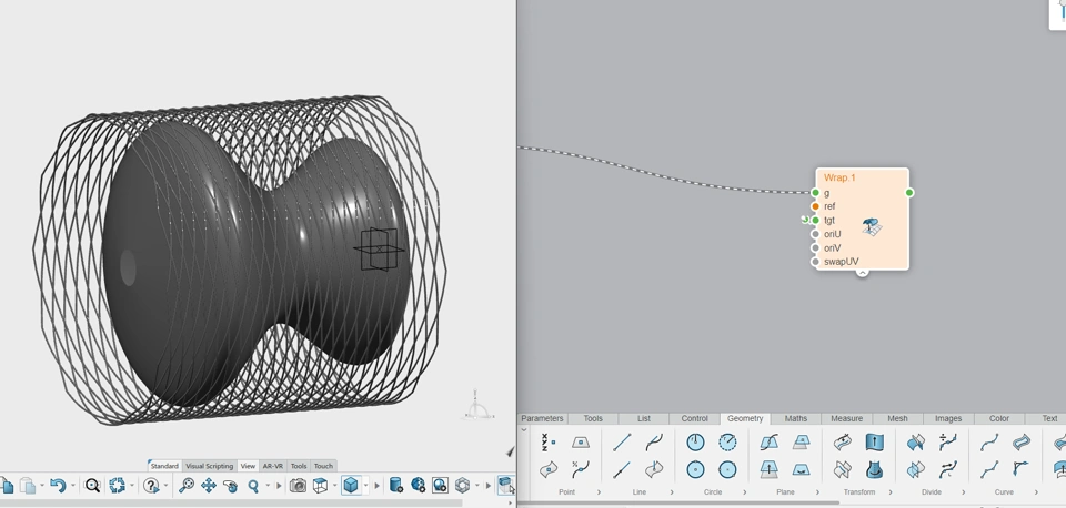 I need to wrap a braided pattern's sweep splines onto a revolute surface. Since GGR lacks a "develop" operator, I tried using "unfold & transfer," but it results in overlapping or intersecting sweep curves. "Wrap on surface" is another option, but the helical sweeps don't have a reference surface.