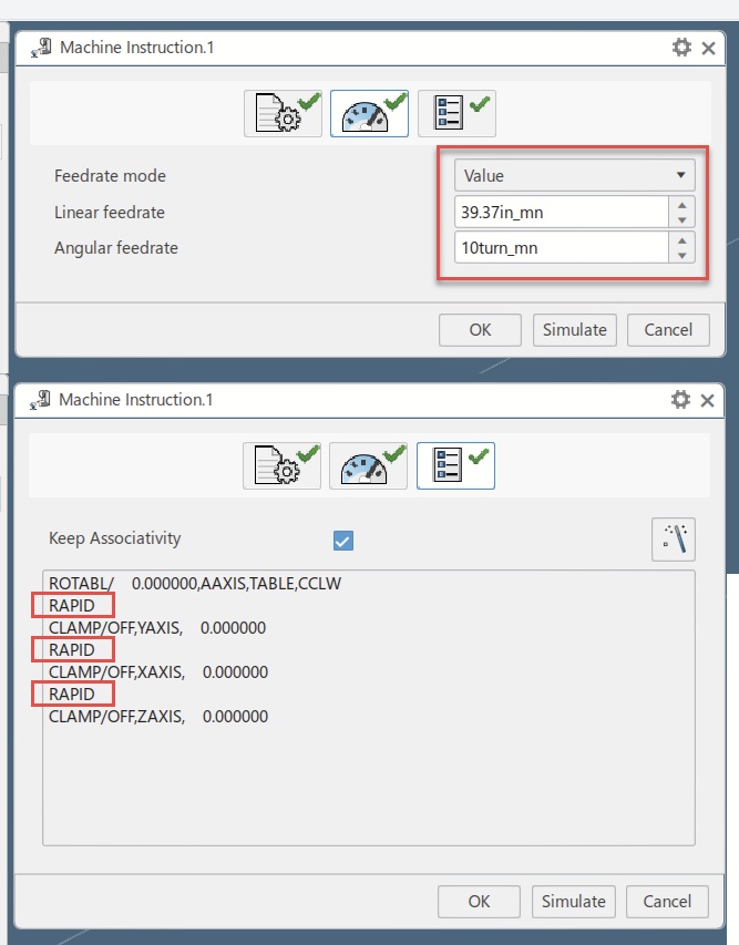Please see attached images of a machine instruction. It appears "Feedrate mode" is not honored if "Value" is selected. It is still output as a "RAPID" statement. Does it require modifications in PPtable?